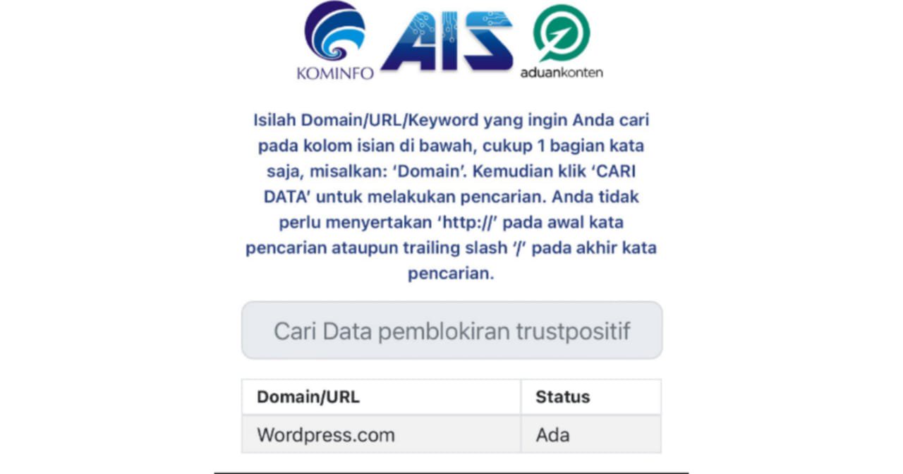 Pada utasnya, tampak WordPress masuk ke dalam daftar situs yang diblokir oleh Kemenkominfo yang bisa dilihat pada laman aduan konten milik Kemenkominfo
