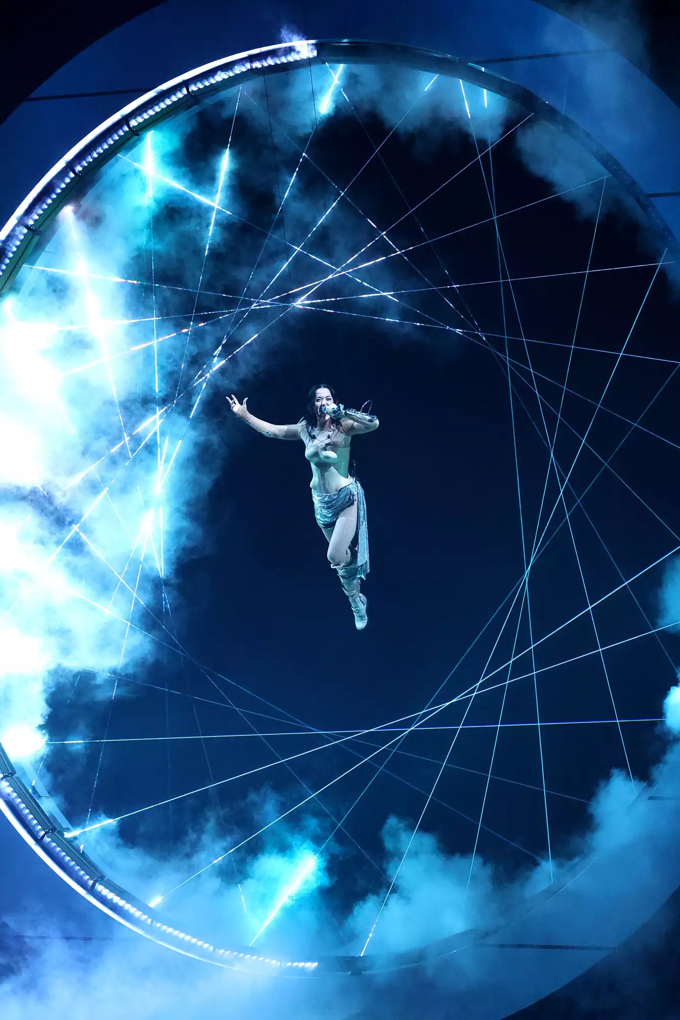 Dalam momen yang memukau, Katy Perry membawa elemen fantastis ke atas panggung dengan cara yang tidak pernah terpikirkan sebelumnya terbang di udara sambil membawakan penampilannya dengan penuh energi.
